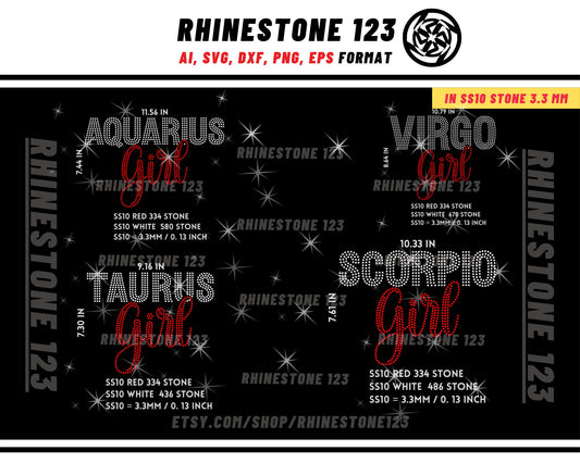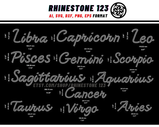 BUNDLE ALL Zodiac Sign Rhinestone Template writing 12 in 1 for Tshirts rhinestone template material Svg Eps Png Ai Dxf rhinestone projects