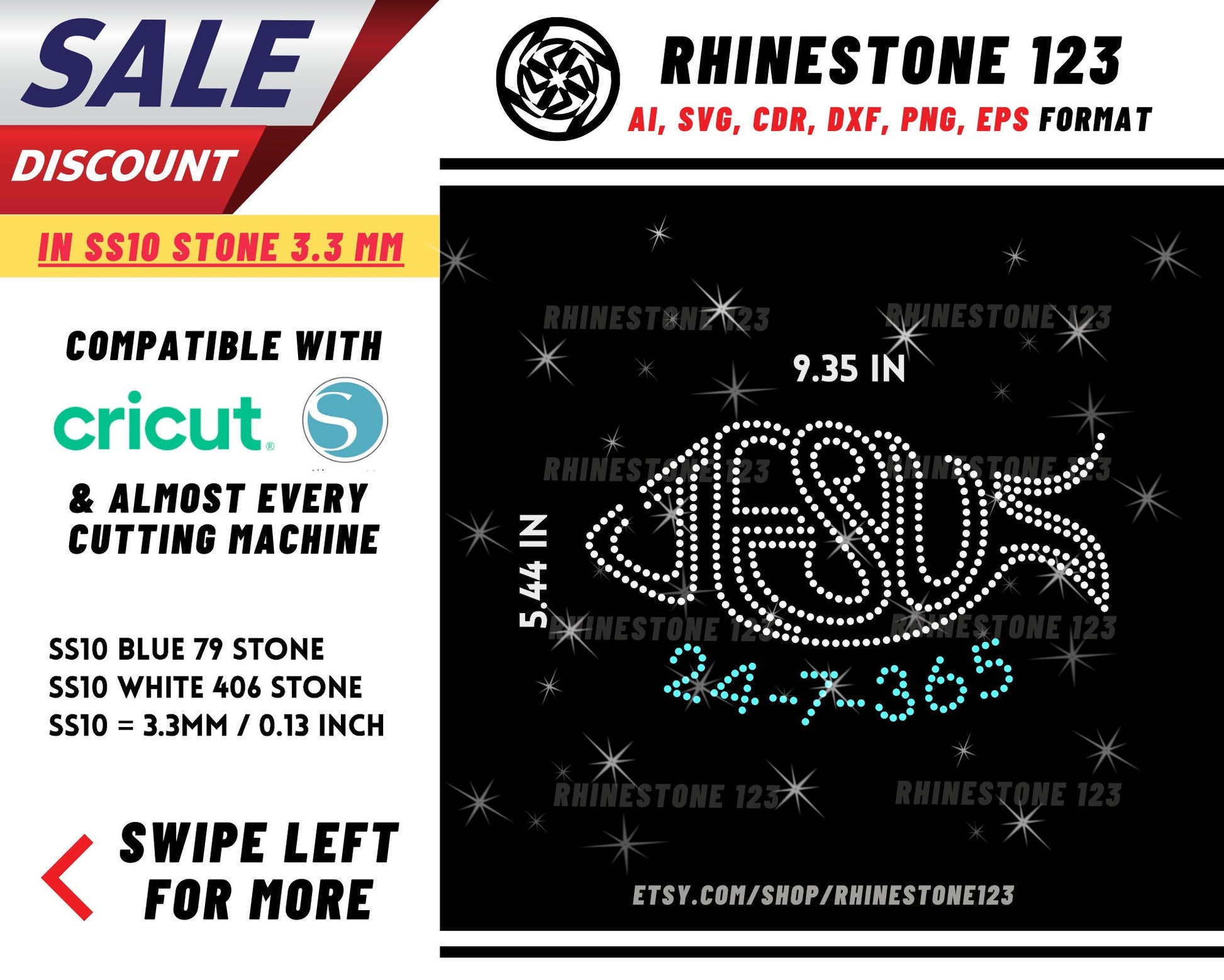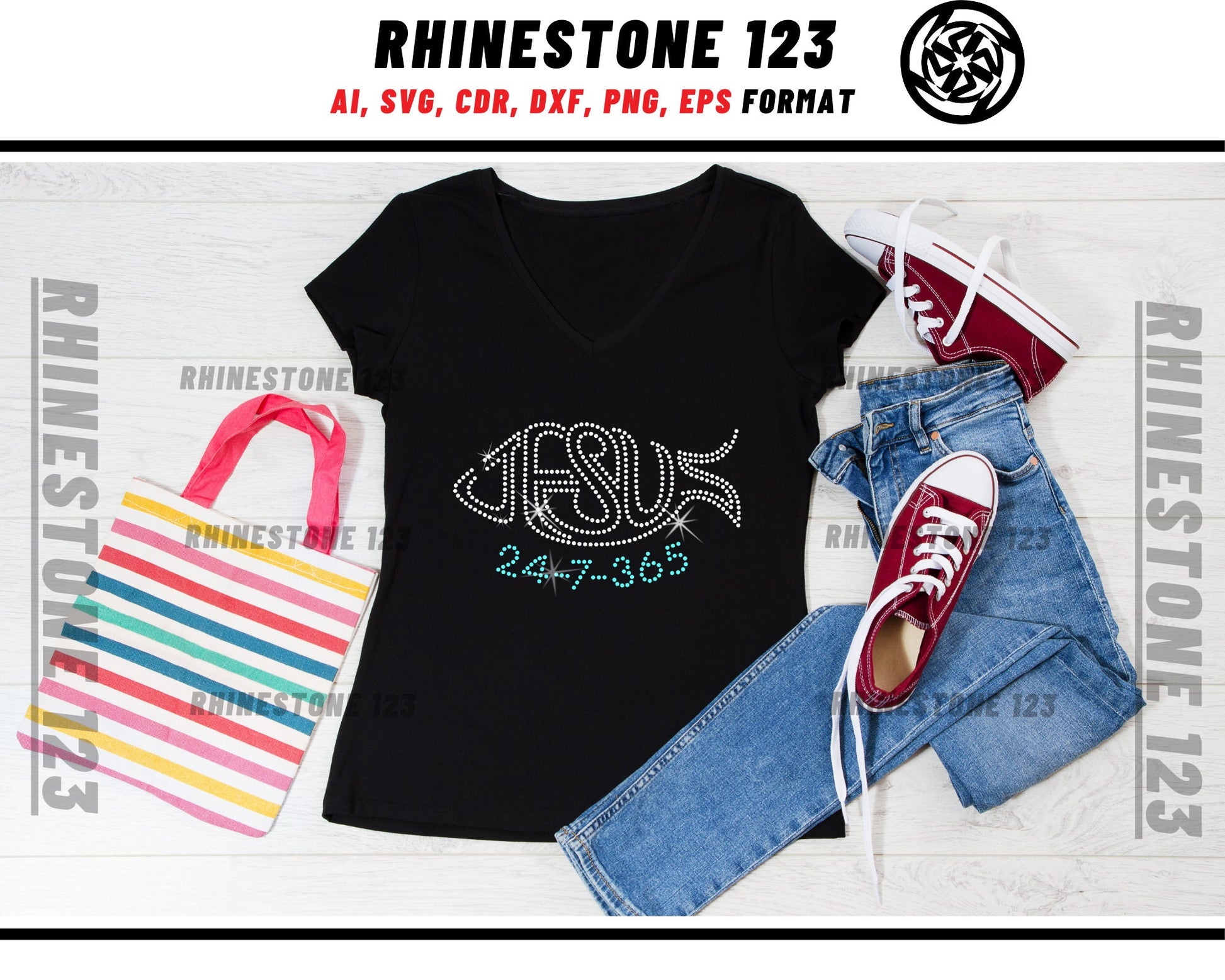 Christian Fish Jesus 247 365 Rhinestone Template, cricut, silhouette, Rhinestone SVG, Rhinestone File for SS10, PNG, AI, cdr, dxf, eps